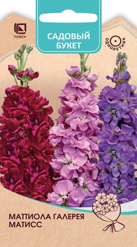 МАТТИОЛА Галерея, Матисс Ароматные махровые соцветия великолепны для букетов! Растение красивой пирамидальной формы, высотой 70 см. Листья ланцетные, серовато-зелёные. Крупные цветки собраны в мощные вертикальные соцветия. Гармоничная смесь из розовой, красной и синей окрасок. Цветёт в июне-августе. Идеально подходит для срезки. Также используют для посадки в клумбы и миксбордеры. В срезанном виде стоят в воде 8-12 дней.