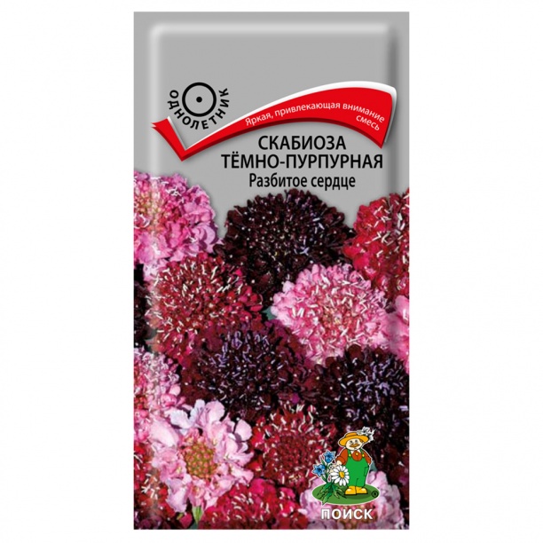 СКАБИОЗА Разбитое сердце, тёмно-пурпурная Яркая привлекающая внимание смесь. Стебли прямые, ветвистые, 80 см высотой. Пушистые крупные соцветия, диаметром до 5 см, на длинных цветоносах. Соцветия красные, розовые и тёмно-бордовые. Цветет с июля по октябрь. Используют в группах, рабатках, миксбордерах и на срезку. Срезанные цветы сохраняются в воде 5-7 дней. Агротехника. Растение светолюбивое, холодо- и засухоустойчивое. Предпочитает плодородные, легкие почвы богатые перегноем. Полив умеренный.Посев производят в конце марта - начале апреля в рассадные ящики. При температуре почвы +16-18?С всходы появляются через 8-14 дней. Сеянцы пикируют и в начале июня высаживают на постоянное место, выдерживая расстояние между растениями 25-30 см. Можно сеять в открытый грунт на постоянное место в начале мая.